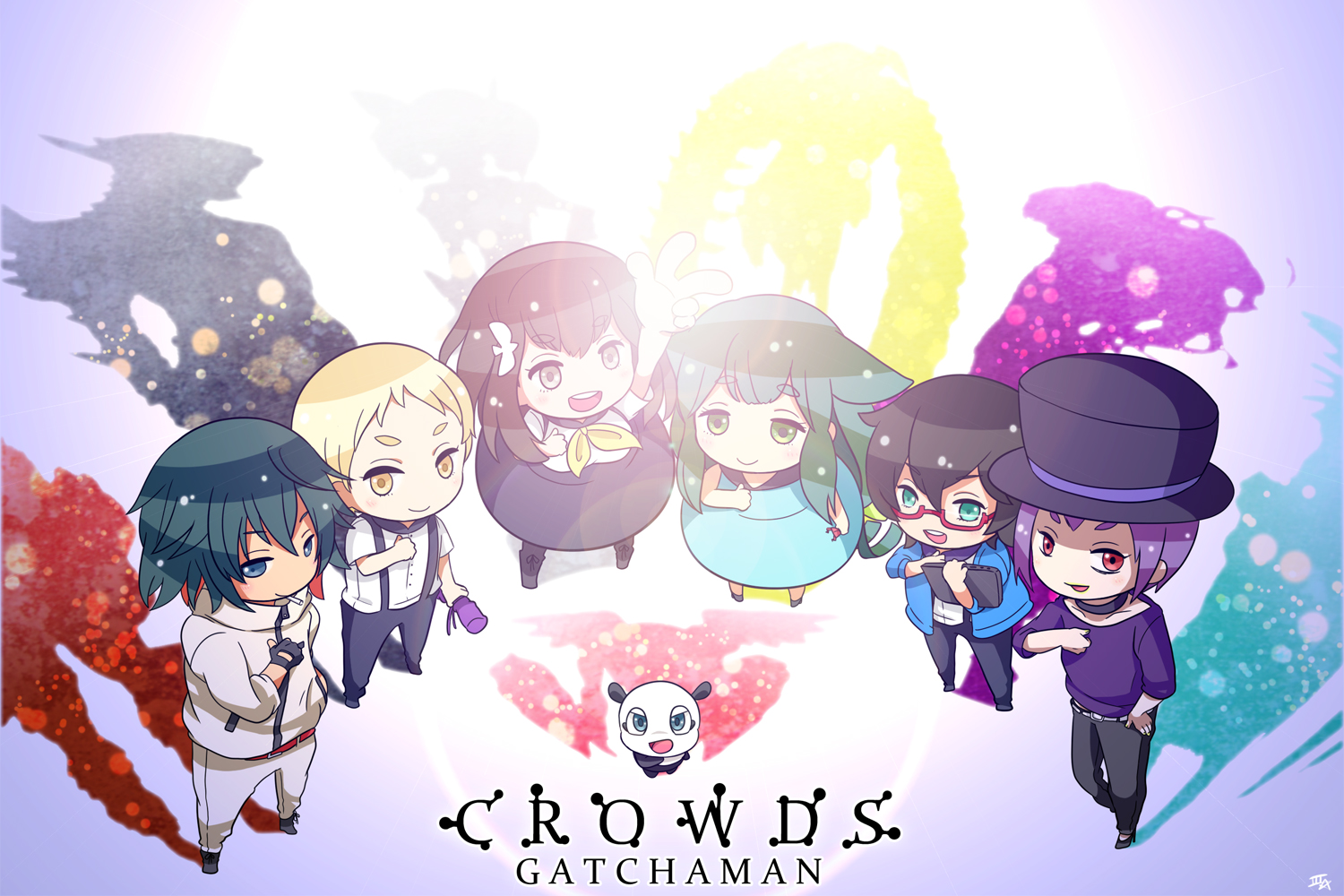 Description: A group of cartoon characters standing next to each other on a purple background with a panda bear in the middle.