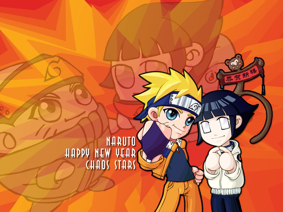 Description: A couple of cartoon characters standing next to each other on a red background with a caption that reads happy new year.