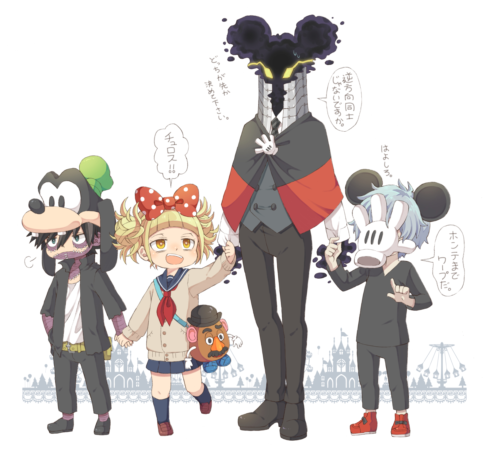 Description: A group of cartoon characters standing next to each other in front of a statue of mickey mouse and goofy mouse.