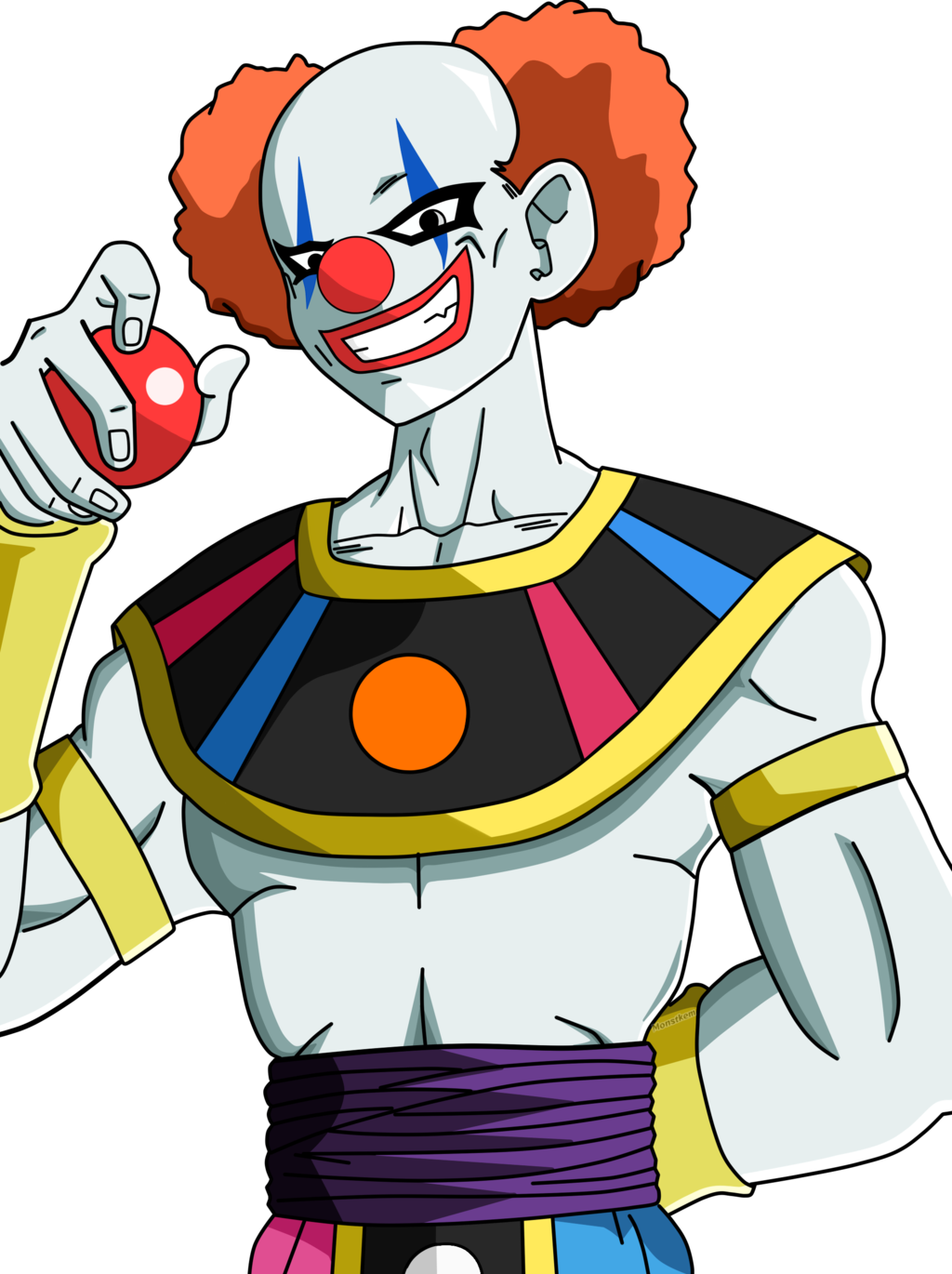 Description: A cartoon clown with a clown mask and a clown wig holding a red ball in his hand and a black background.
