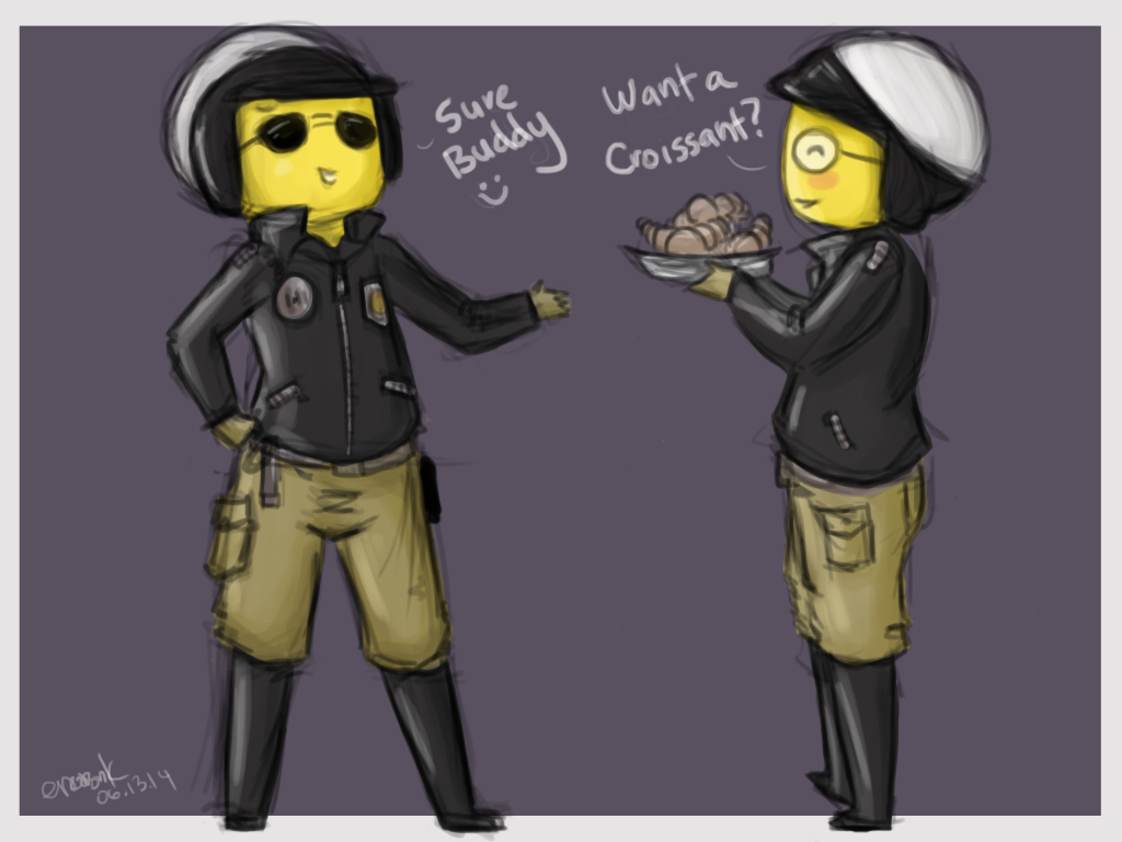 Description: A couple of cartoon characters standing next to each other holding food in their hands and one holding a plate.