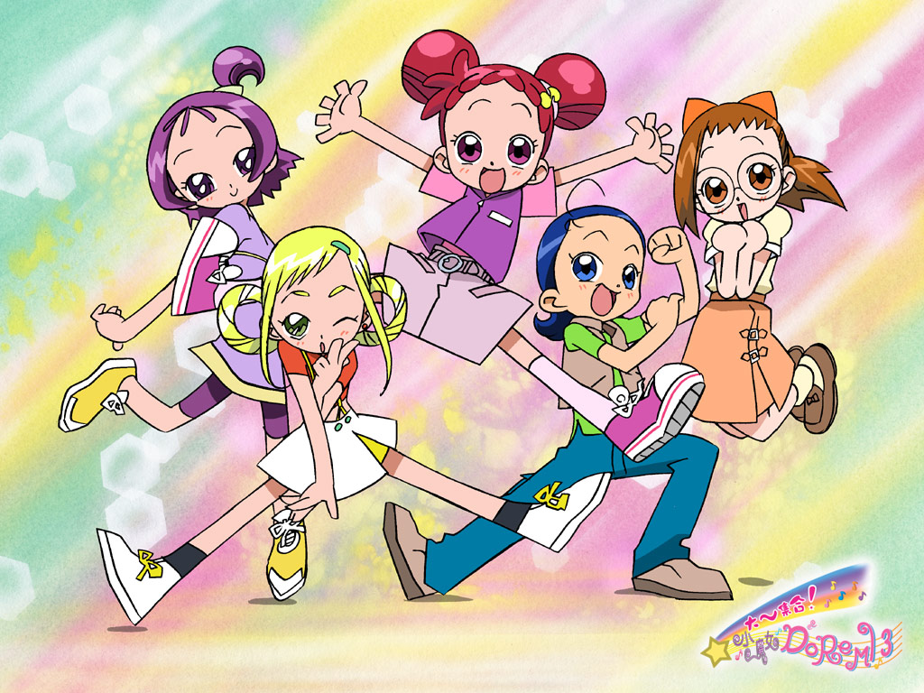 Description: A group of cartoon characters are dancing together in a cartoon style with a rainbow background and a rainbow background.