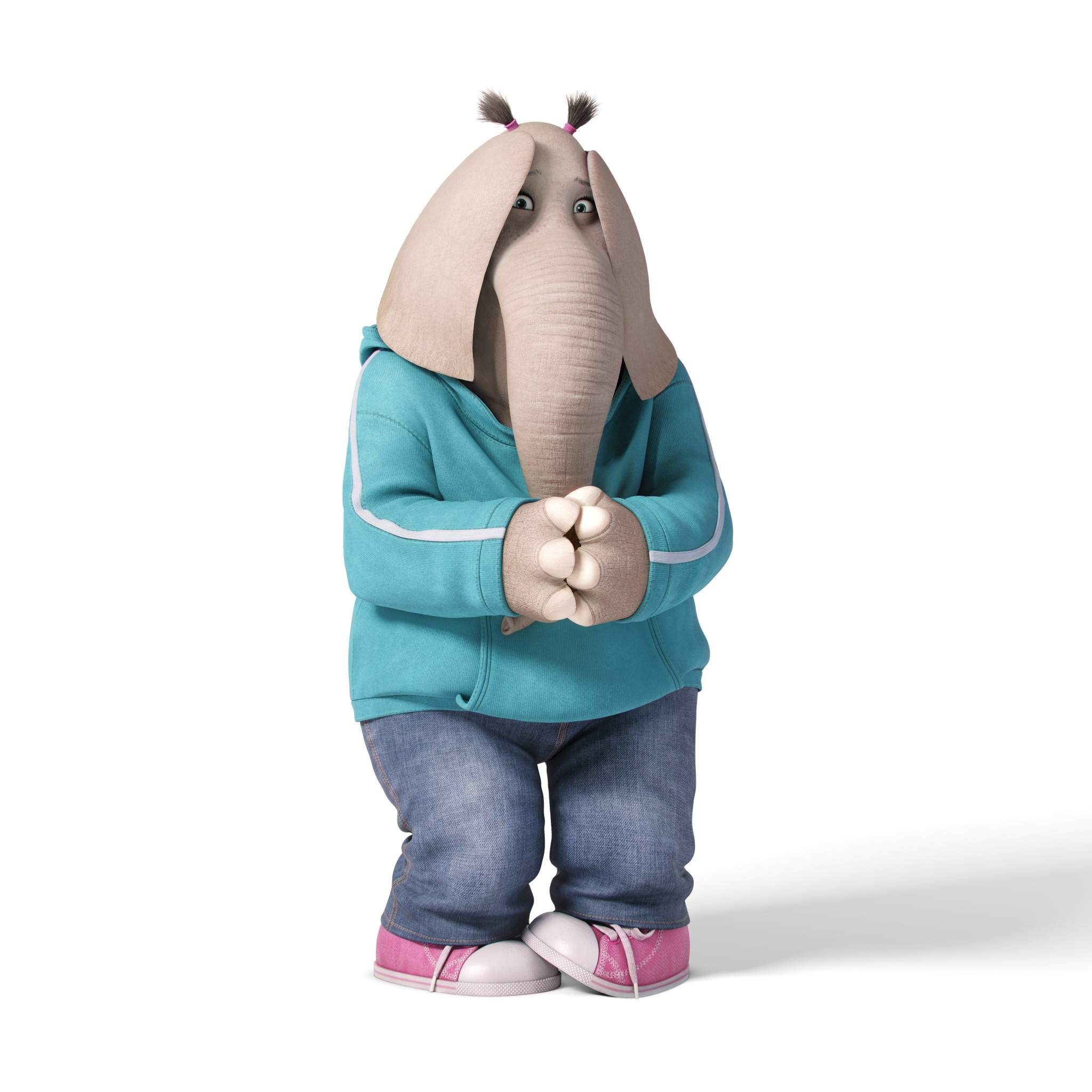 Description: A cartoon elephant in a blue shirt and jeans standing with his hands folded up in front of his face.