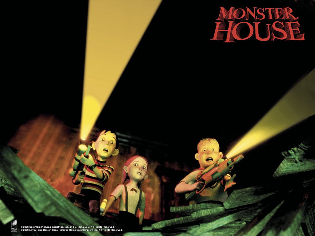 Description: A group of cartoon figures standing on top of a roof in front of a building with a light coming from it.