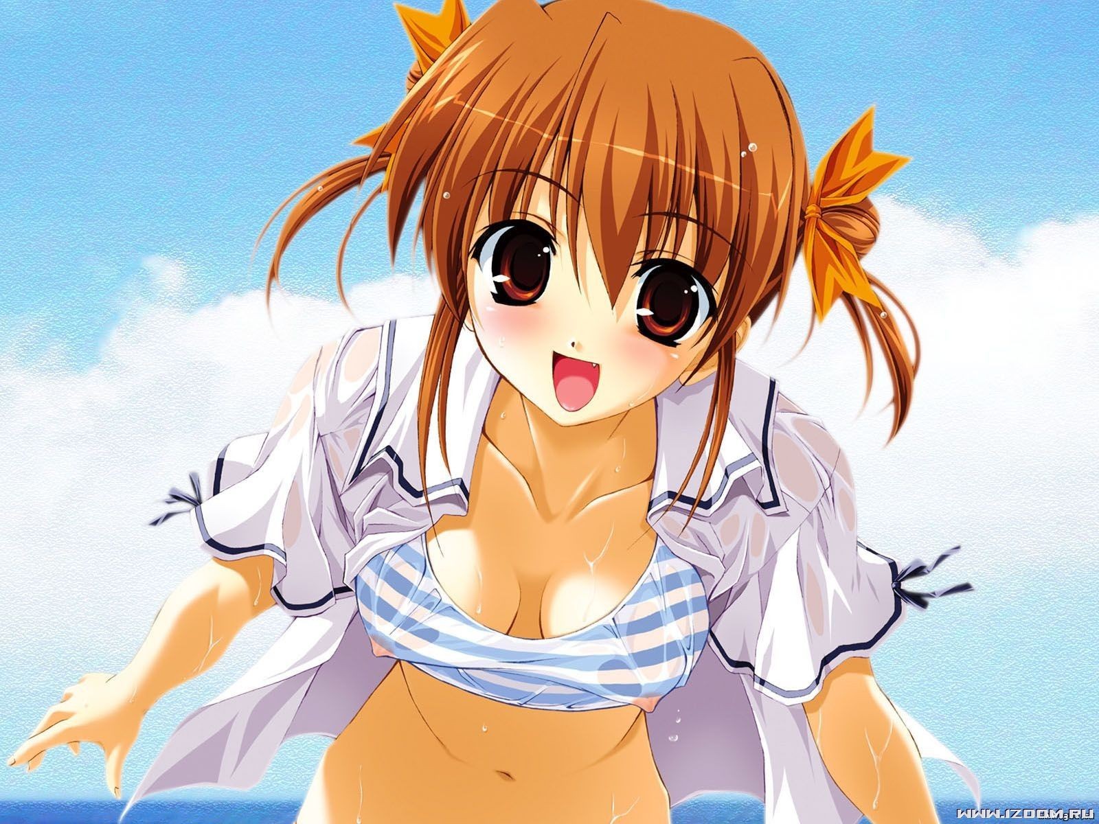 Description: A cartoon girl with big breast and big breast breasts standing on the beach with her arms out and her shirt open.
