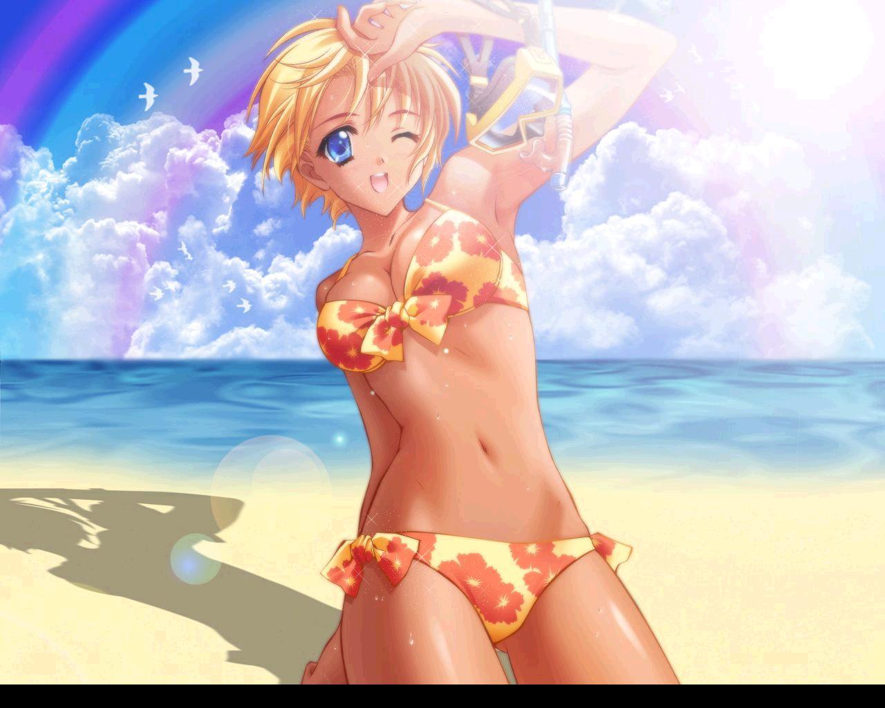 Description: A cartoon girl in a bikini on a beach with a rainbow in the background and a rainbow in the sky.