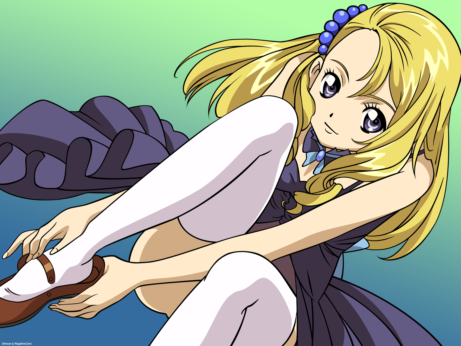 Description: A cartoon girl with blonde hair and a blue dress is sitting on a pair of shoes and has her hand on her leg.