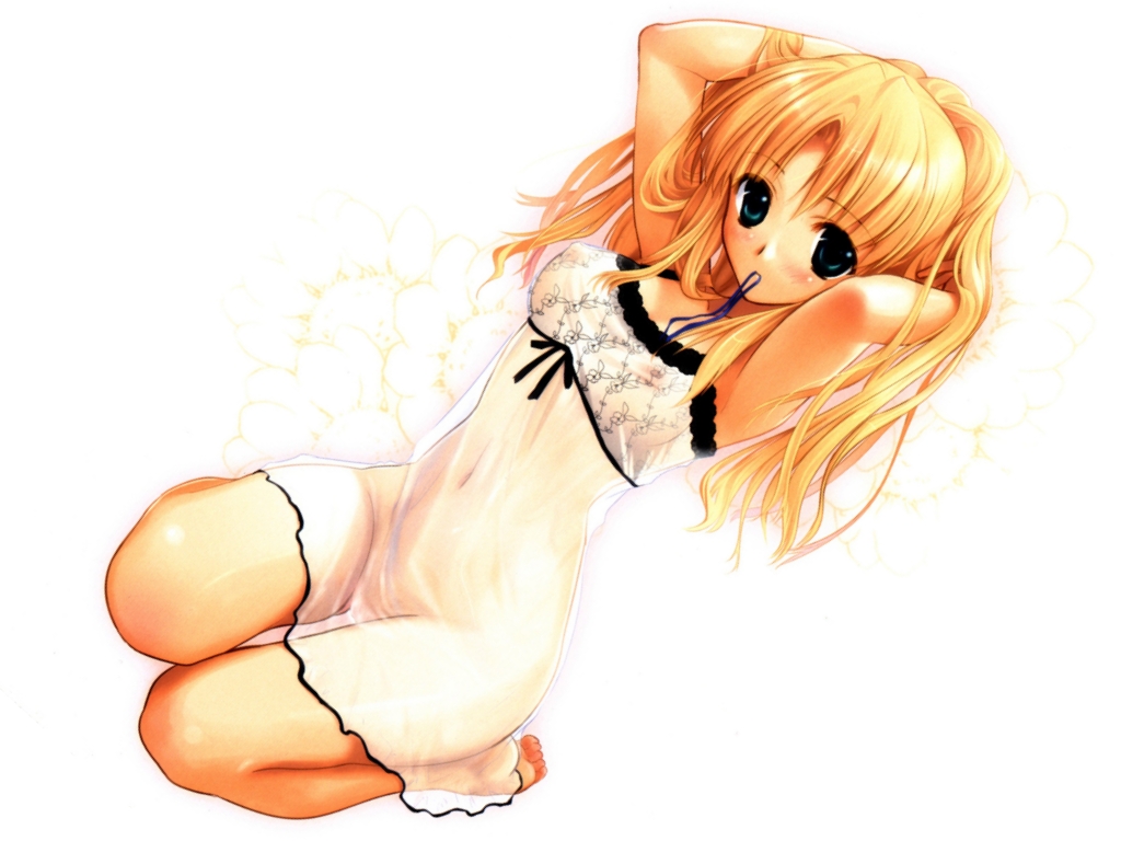 Description: A cartoon girl with blonde hair and a white dress laying on her stomach and looking at the camera with a smile.