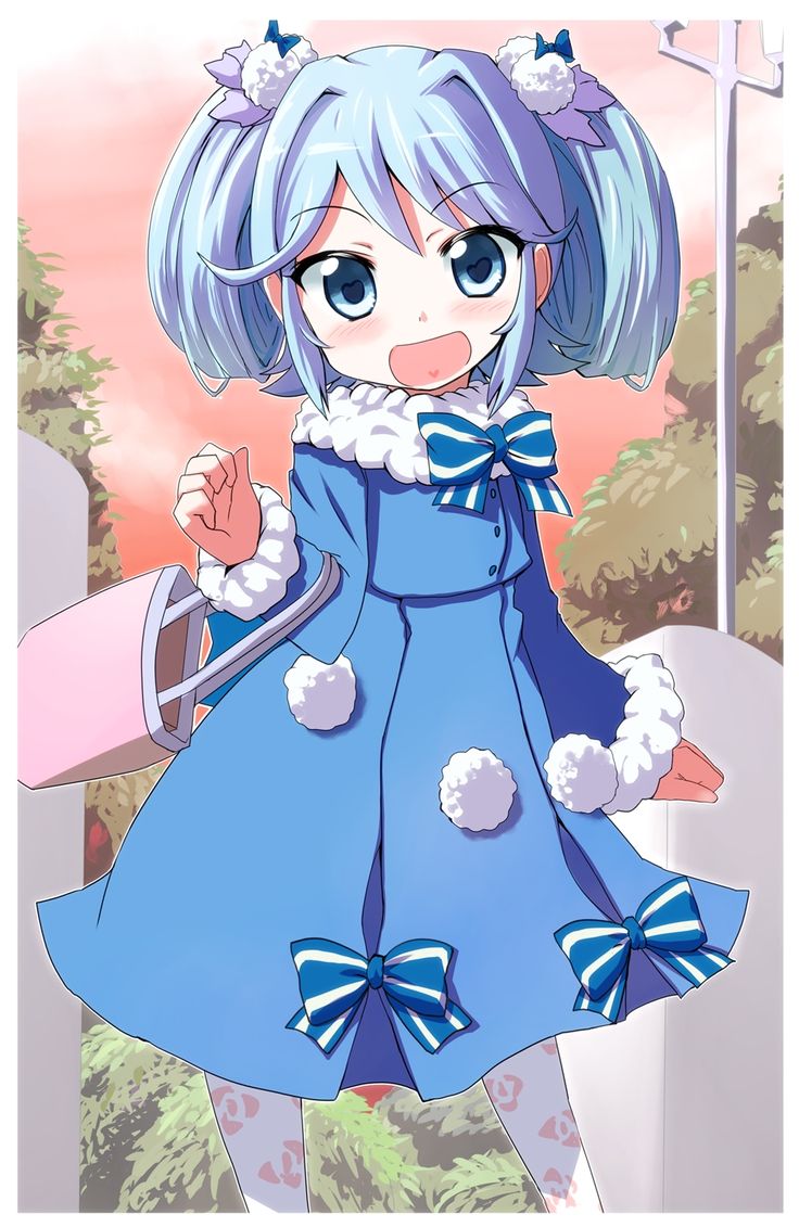 Description: A cartoon girl with blue hair and a blue dress holding a white umbrella and a pink umbrella in her hand.