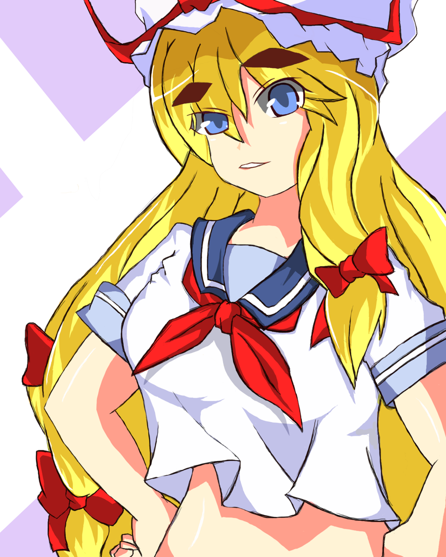 Description: A cartoon girl with a hat and bow tie on her head and a sailor outfit on her body and a sailor outfit on her head.