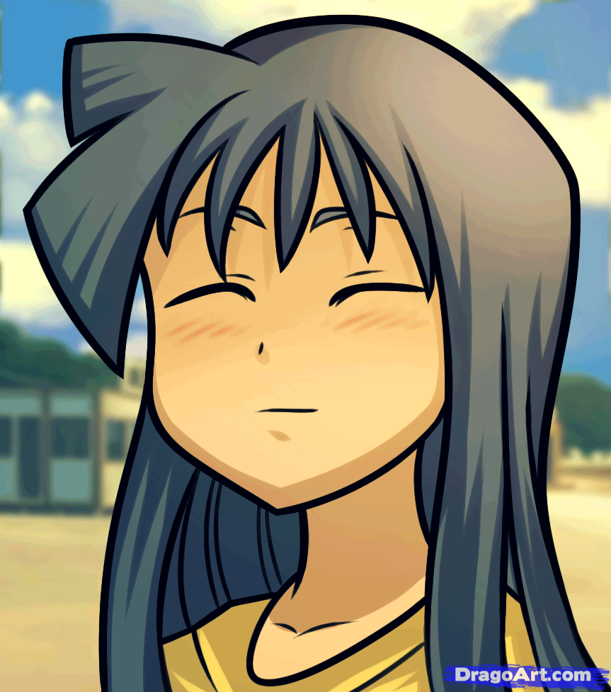 Description: A cartoon girl with long black hair and a yellow shirt with a ponytail and a yellow shirt with a blue sky in the background.