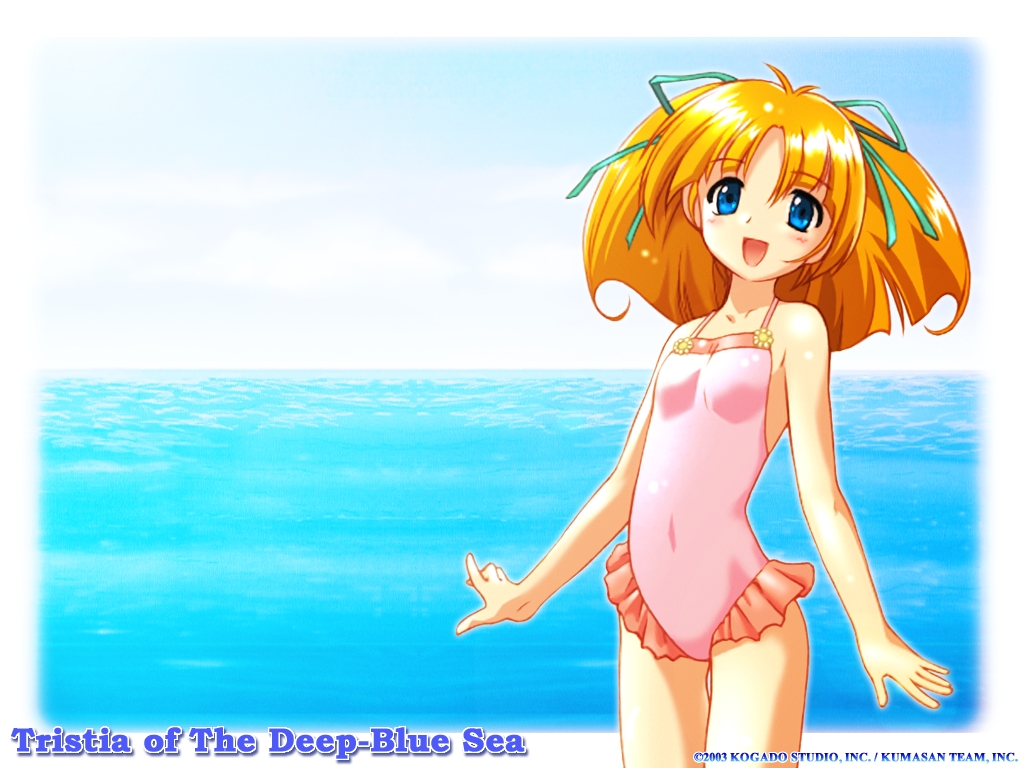 Description: A cartoon girl in a pink bathing suit standing on the beach with her arms out to the side of the body.