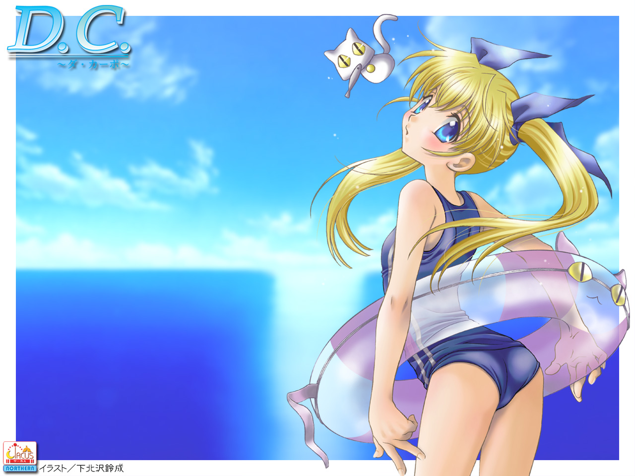 Description: A cartoon girl in a bathing suit holding a surfboard in the ocean with a fish on her head.