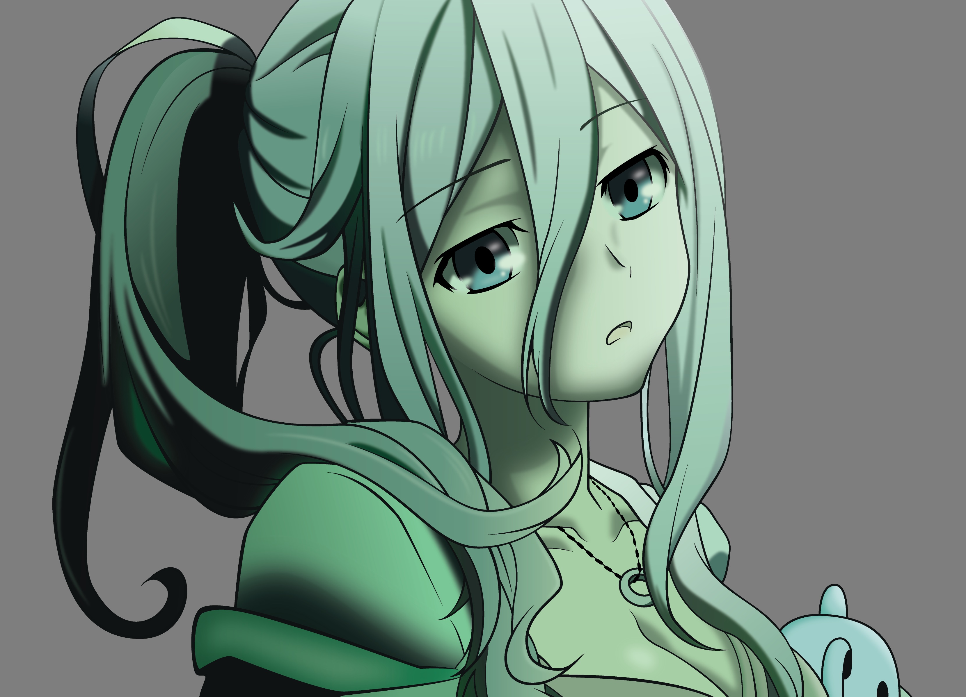 Description: A cartoon character with long hair and a green dress holding a blue teddy bear in her hand and looking at the camera.