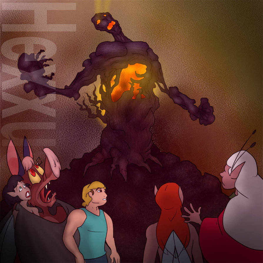 Description: A cartoon of a group of people standing in front of a fire place with a demon on it's face.