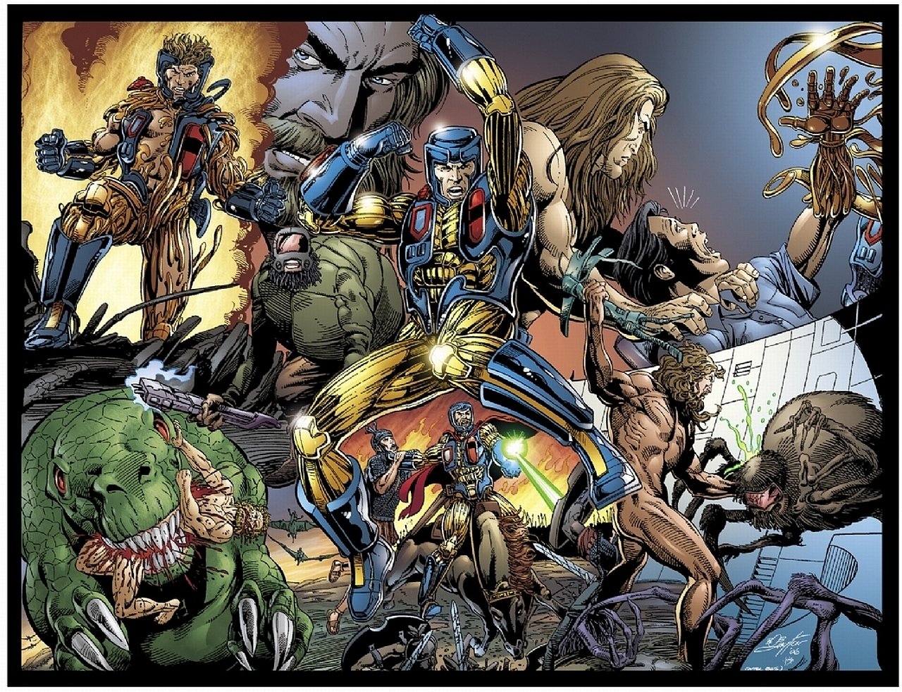 Description: A group of people in a cartoon style with monsters and aliens around them.