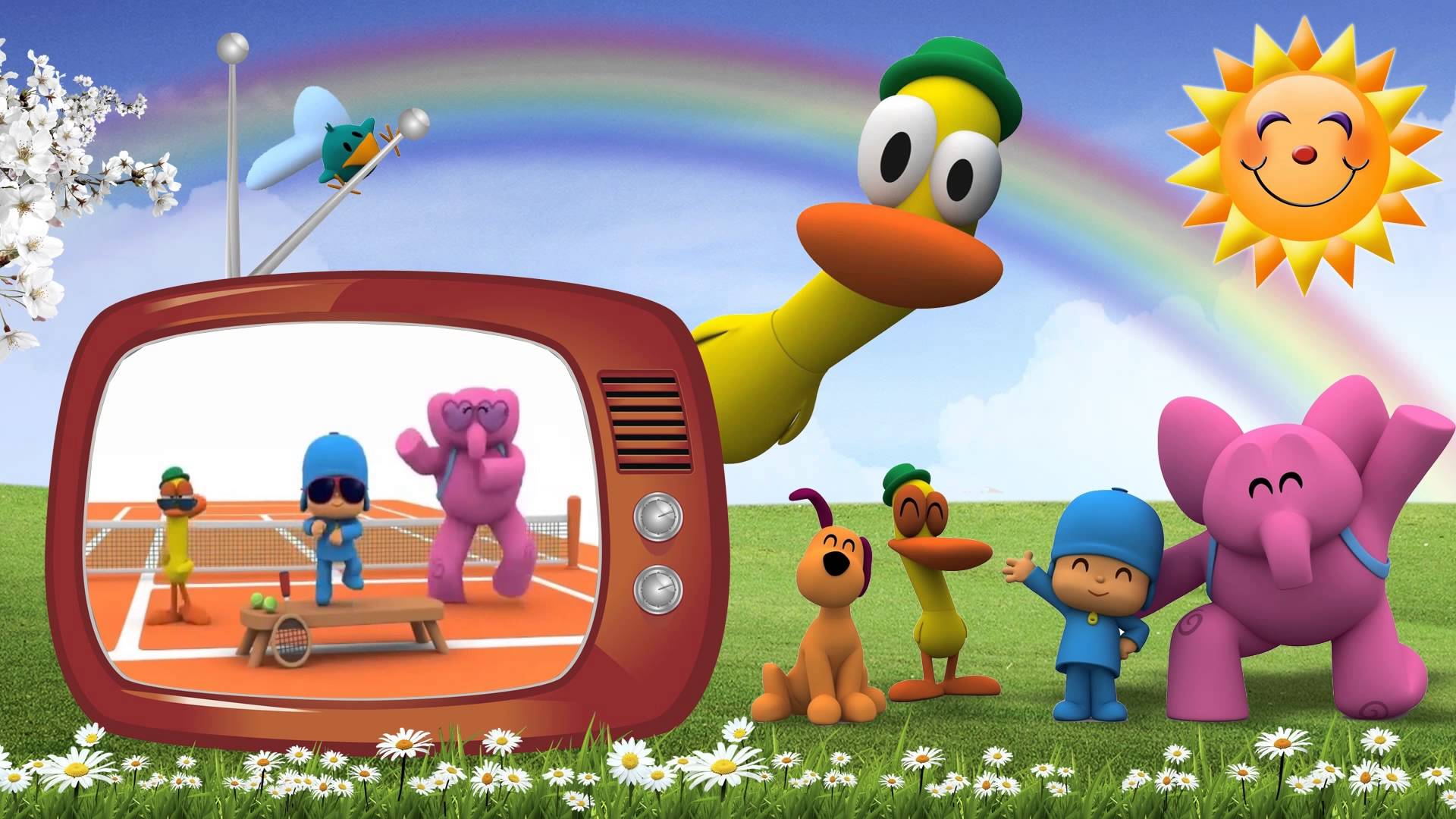 Description: A cartoon picture of a group of people in front of a tv with a rainbow in the background and a rainbow in the sky.
