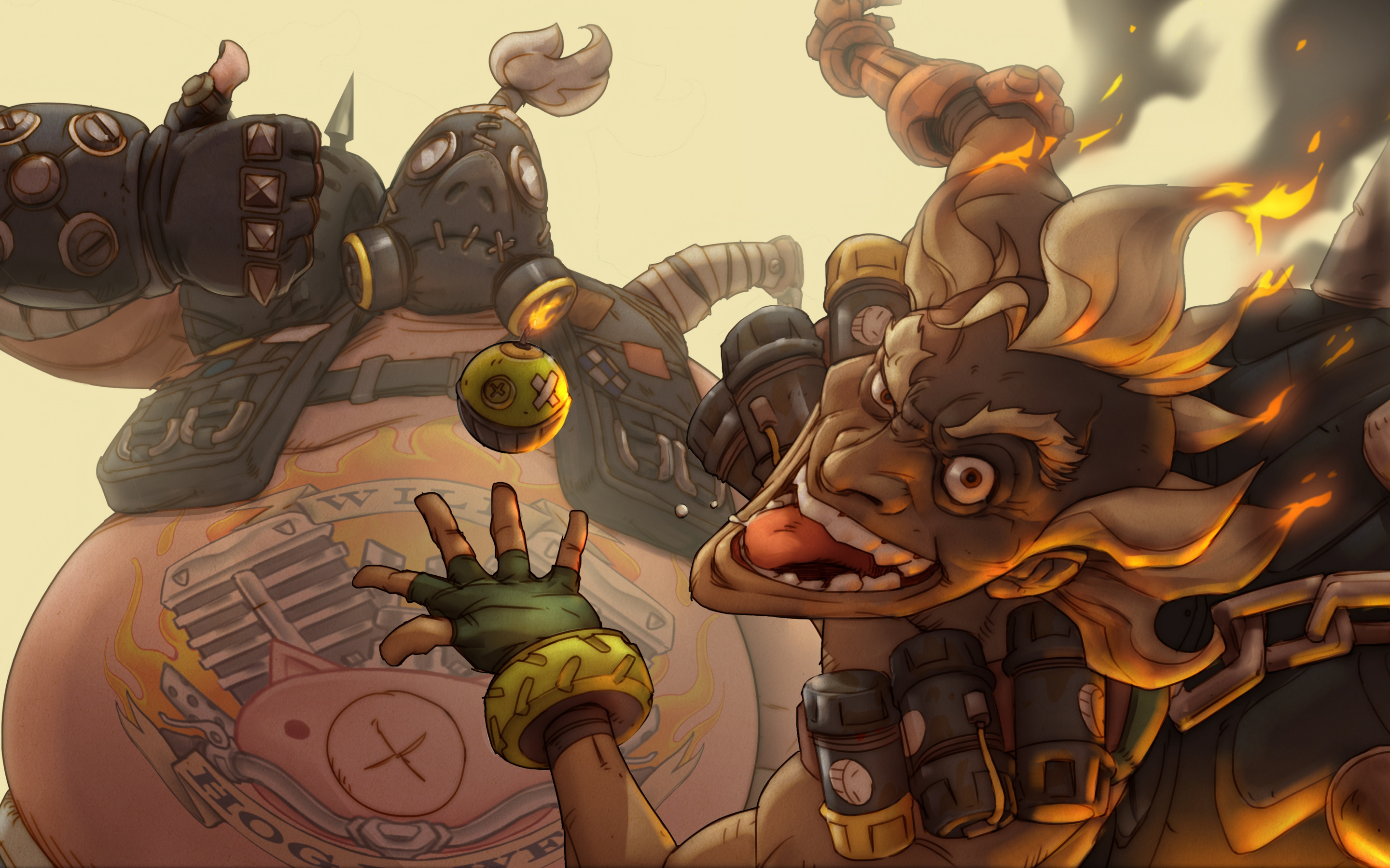 Description: A cartoon character with a huge arm and a huge hand reaching for a ball with fire coming out of it.
