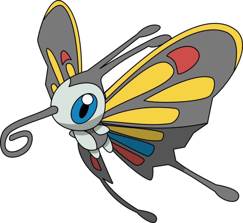 Description: A cartoon insect with a blue eye and yellow wings on its back legs and wings spread out.
