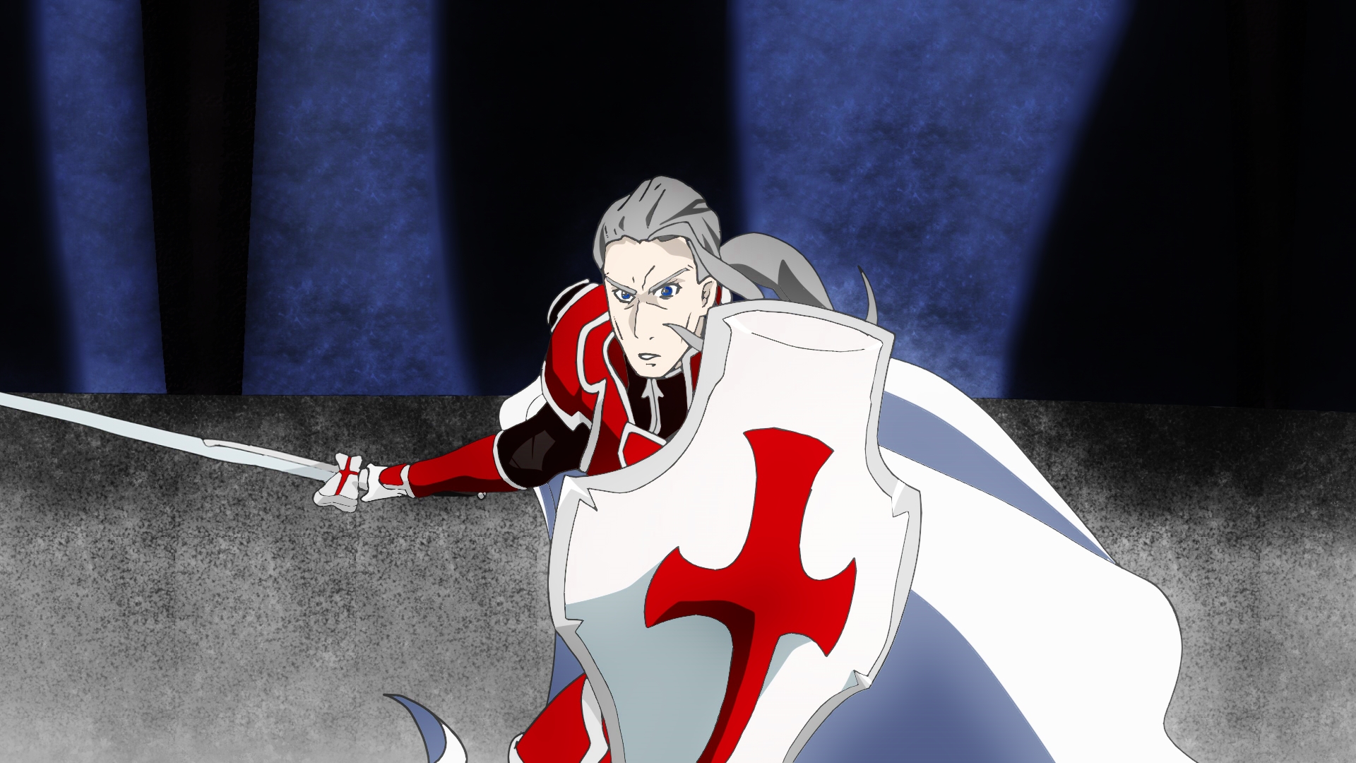 Description: A cartoon of a knight holding a sword and shield with a sword in his hand and a sword in his other hand.