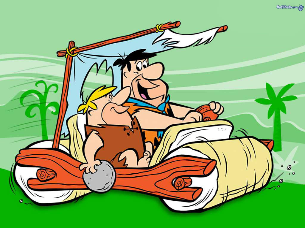 Description: A cartoon of a man and a boy riding a boat with a flag on top of it and a banner on the back.