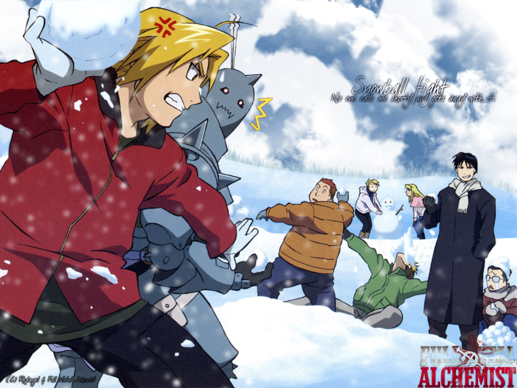 Description: A cartoon of a man with a cat on his shoulder and a group of people in the background in the snow.