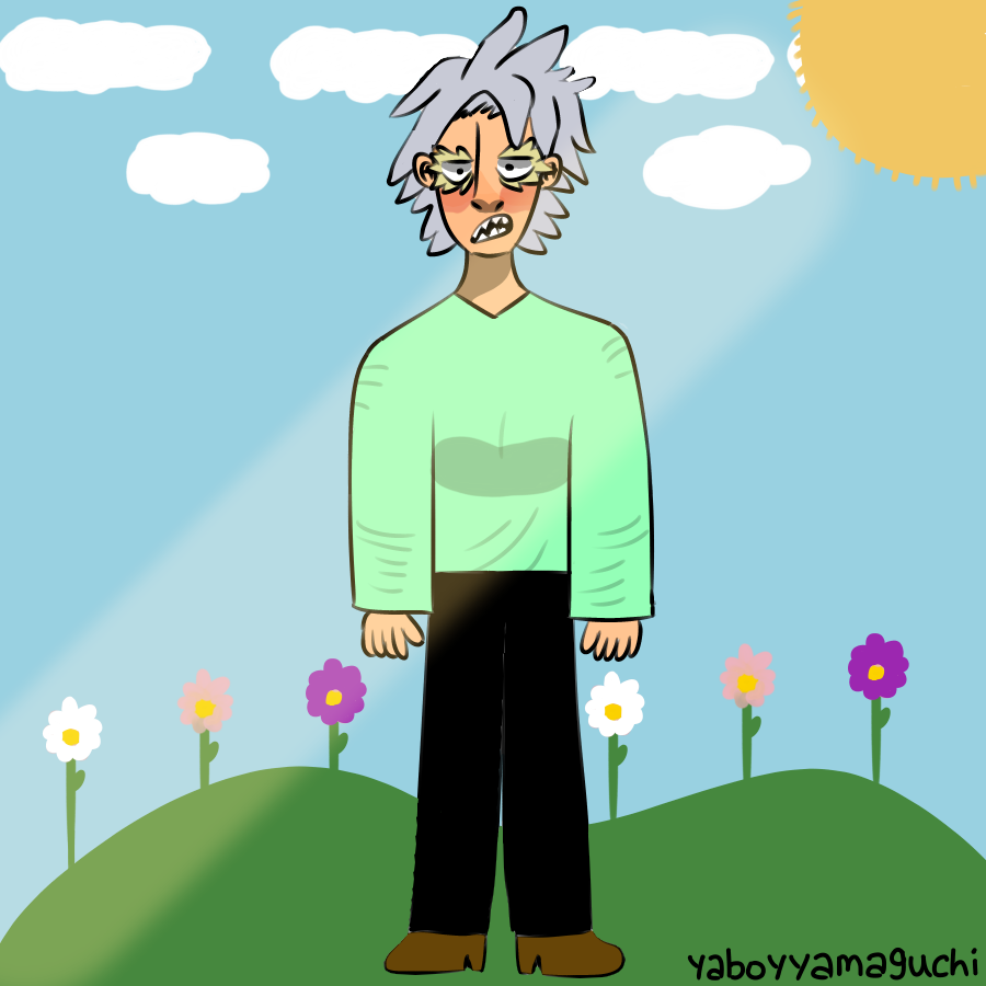 Description: A cartoon of a man standing in a field with flowers in the background and a sun in the sky.
