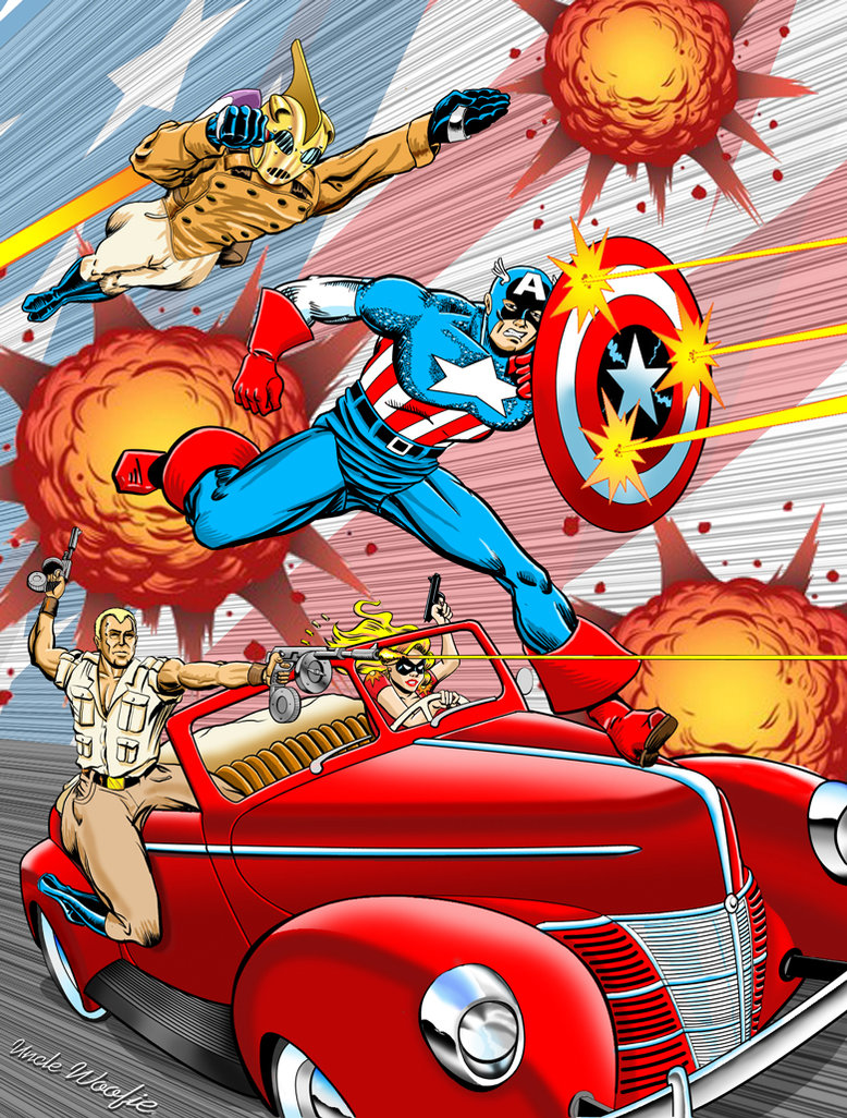 Description: A cartoon of a man flying over a car with a captain america emblem on it's side and another man in a suit.