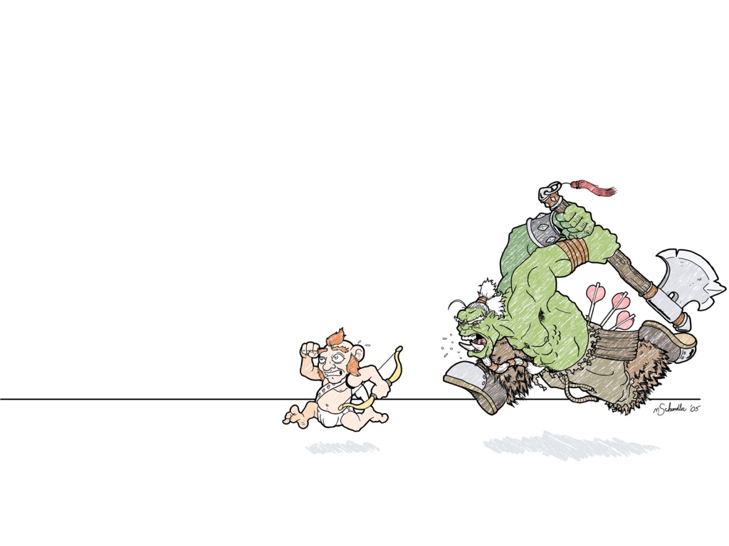 Description: A cartoon of a man in a green suit running with a dog and a hammer in his hand and a pig running behind him.