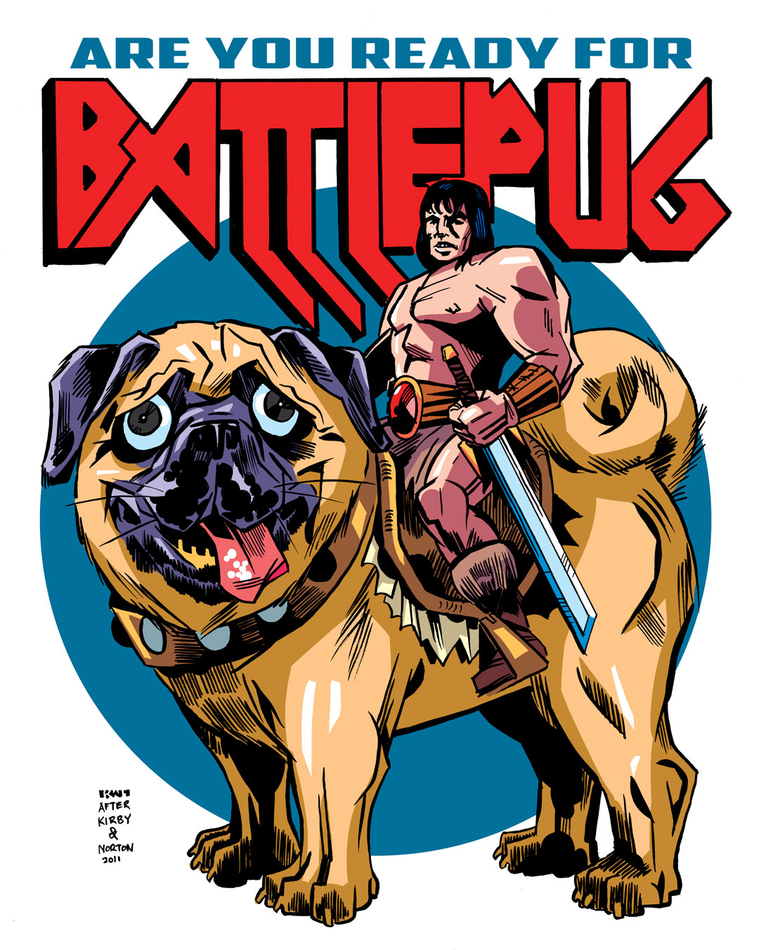 Description: A cartoon of a man riding a dog with a sword in his mouth and a sword in his mouth.