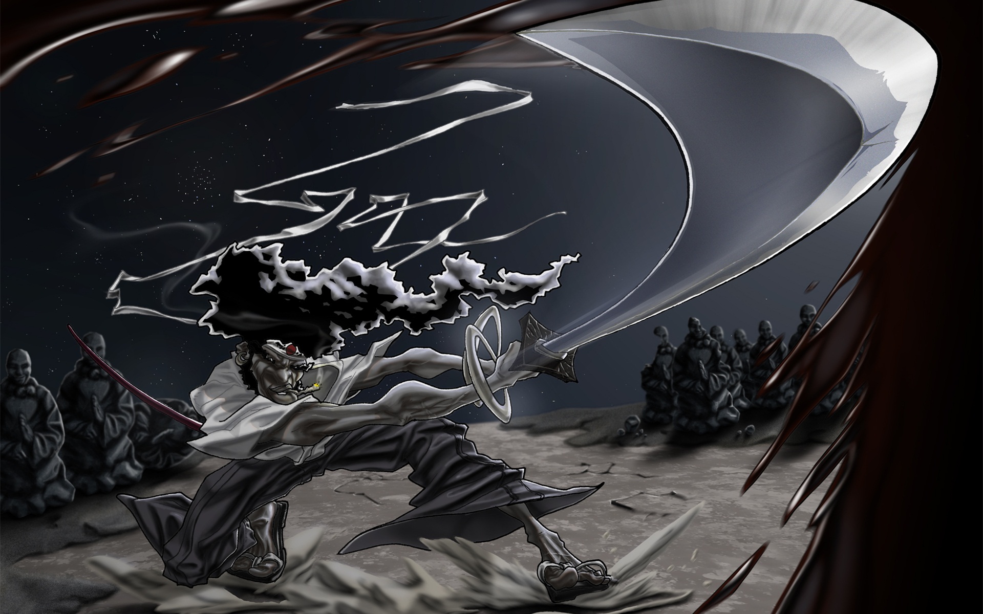 Description: A cartoon of a man with a sword in his hand and a sky background with trees and snow on it.