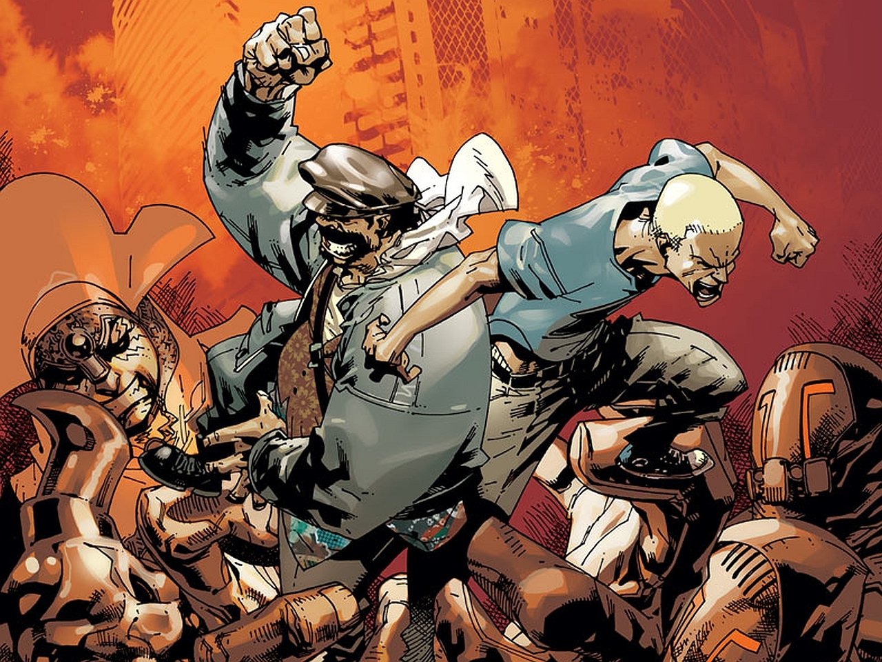 Description: A cartoon of a man being thrown by a group of men in a battle with a robot in the background.