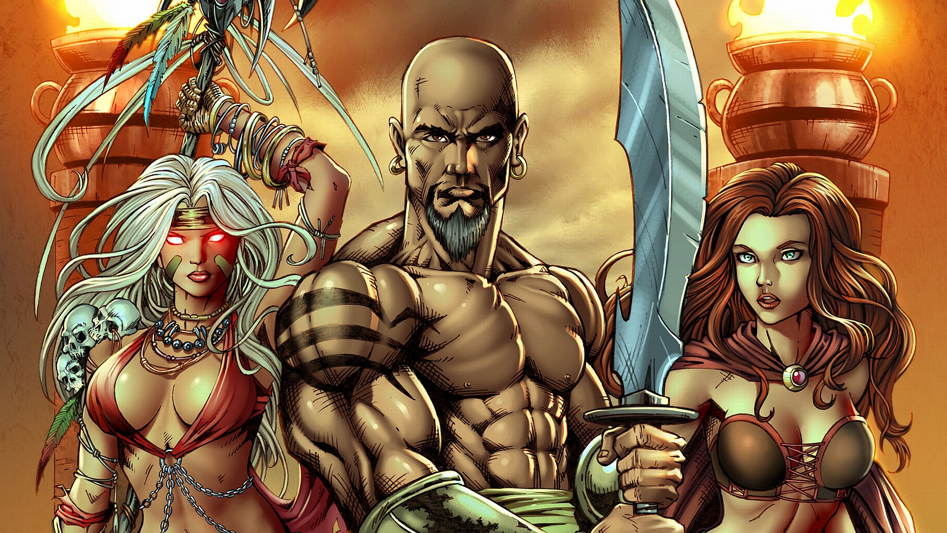 Description: A cartoon of a man and a woman with swords and armor on their backs.