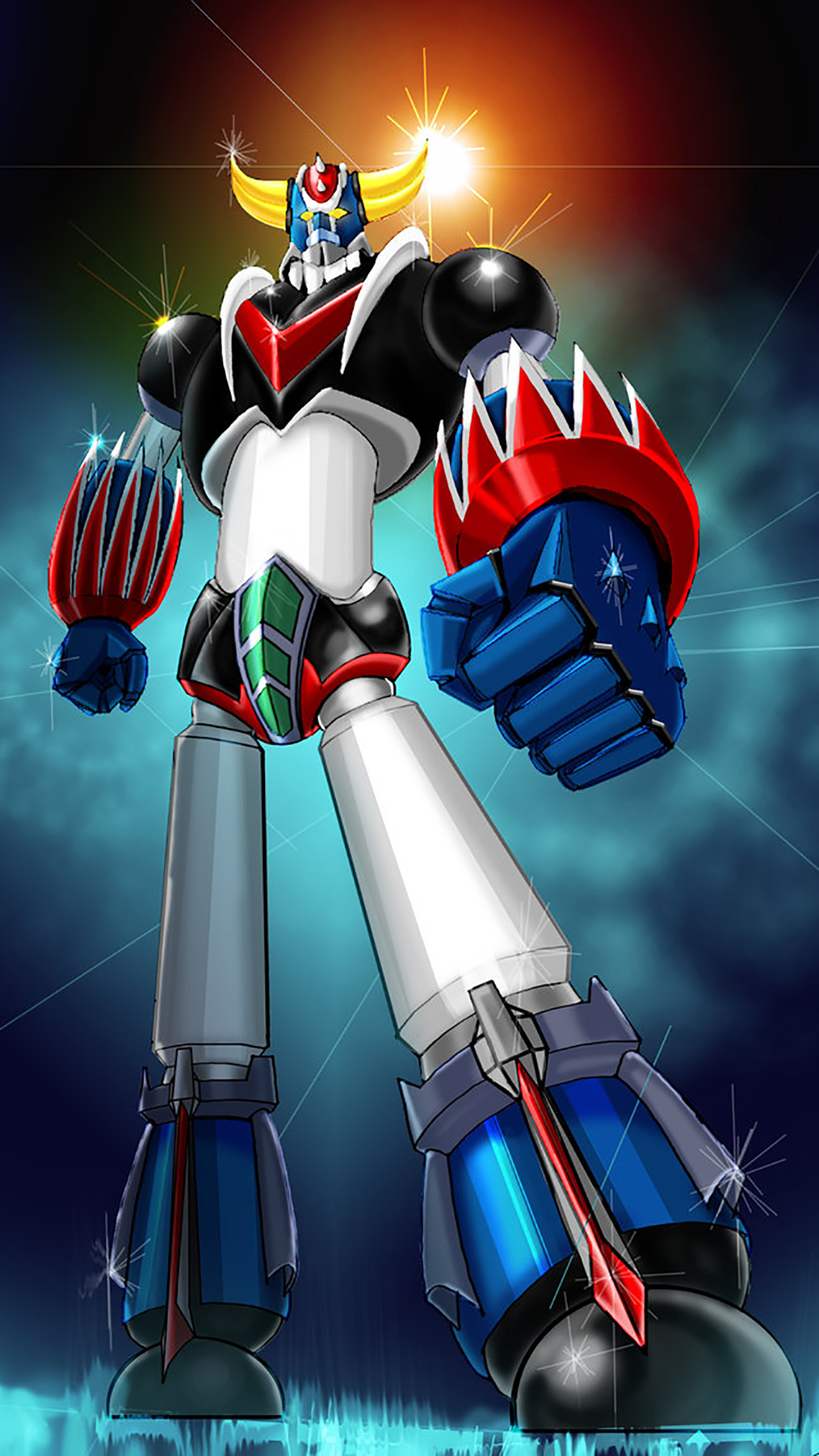 Description: A cartoon character holding a giant red and blue object in his hand and a blue background with a red and white object.