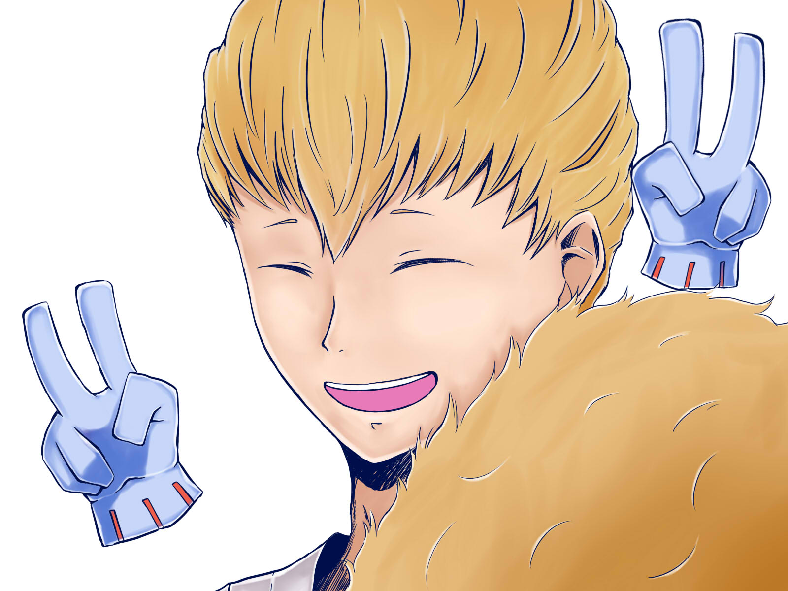Description: A cartoon of a person with a peace sign on his head and a hand gesture in the air above his head.