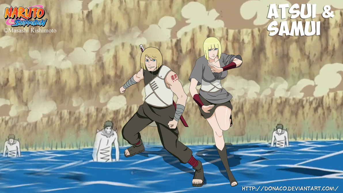 Description: A cartoon of two people running in the water with a background of people in the water and a mountain.