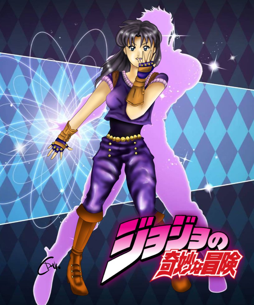 Description: A cartoon character with a purple outfit and boots on a blue background with a checkered pattern and a purple background.