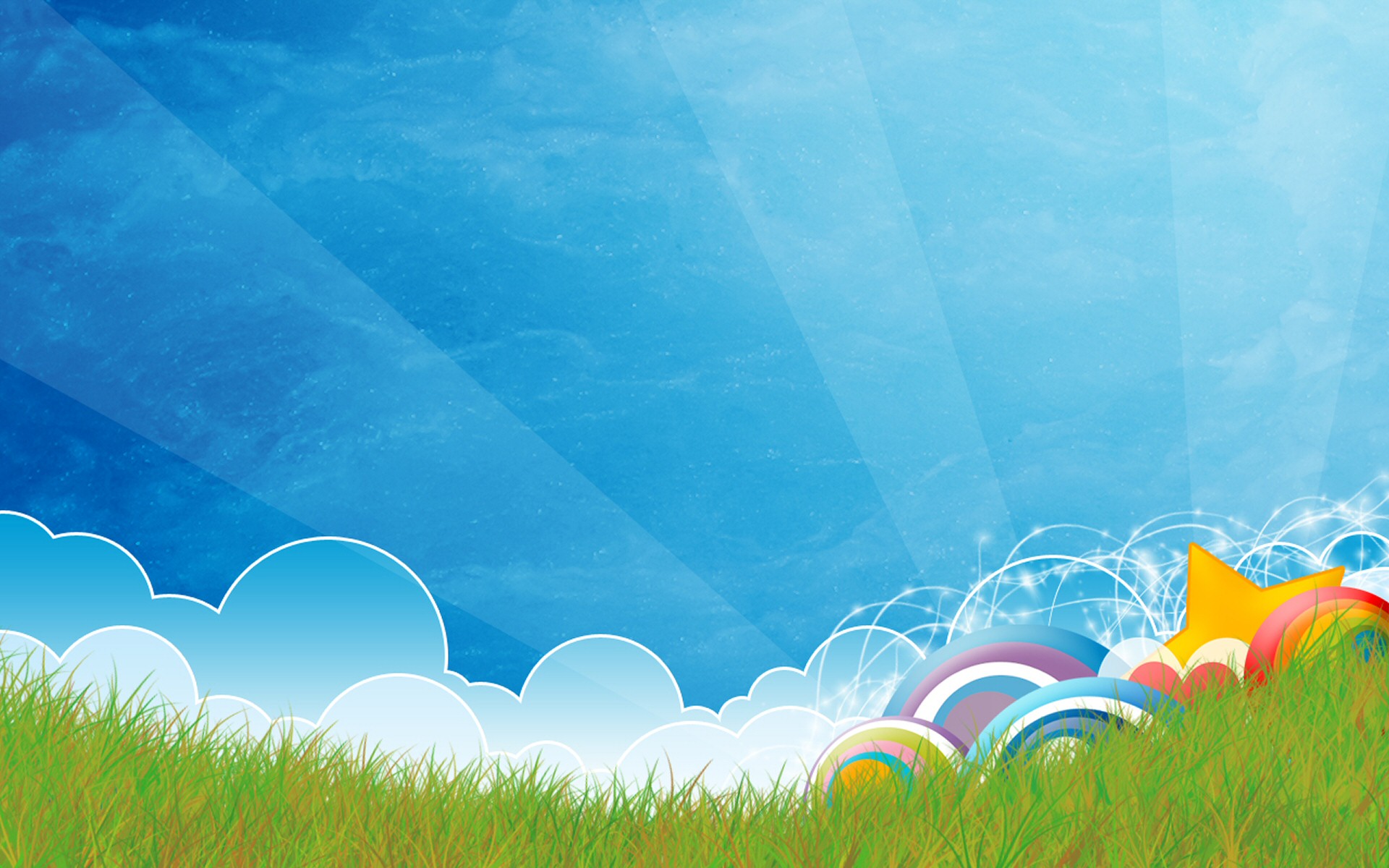 Description: A cartoon scene with a rainbow colored umbrella in the grass and a blue sky with clouds in the background.