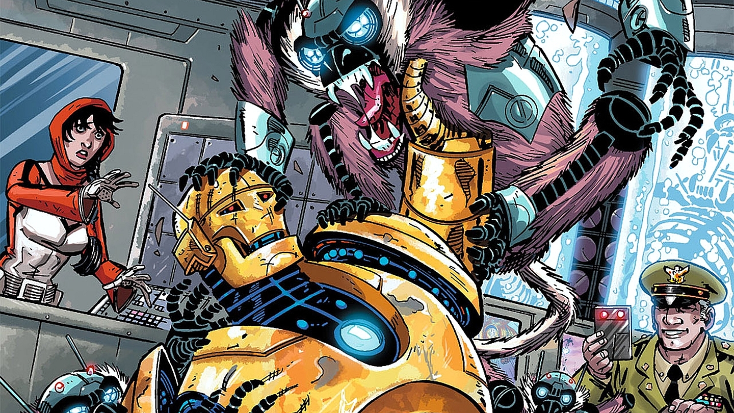 Description: A cartoon of a robot and a man in a space station with other people around him and a robot in the background.