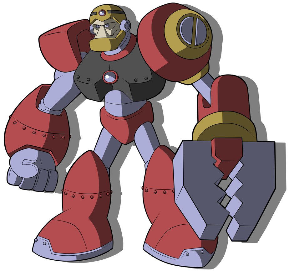 Description: A cartoon character with a red and gray robot suit and a yellow helmet on his head and a red and gray robot with a yellow arm.