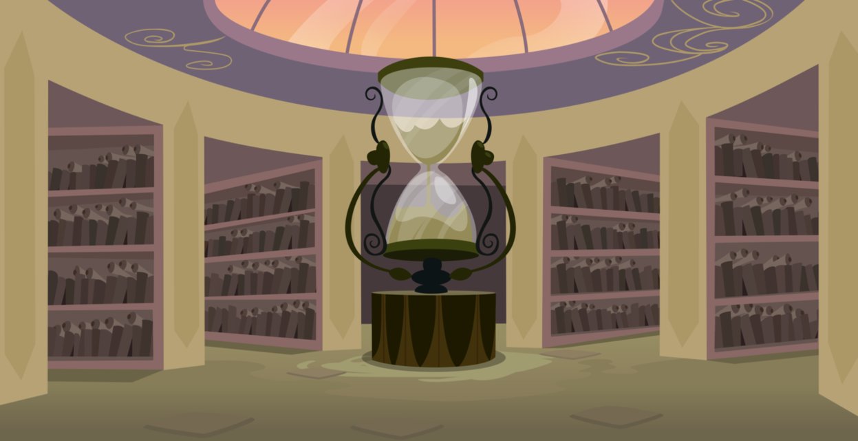 Description: A cartoon of a room with a clock and a lamp in it's center and a bookcase in the background.