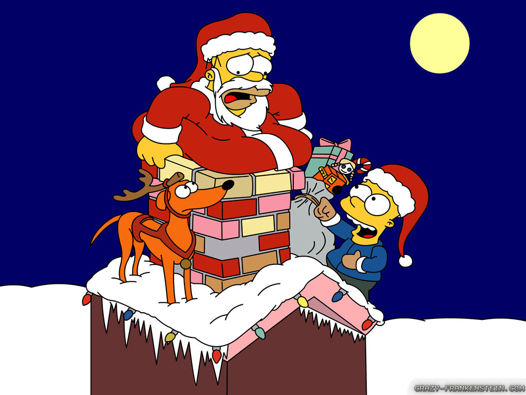 Description: A cartoon santa claus is sitting on a chimney with his reindeers and presents in front of him.