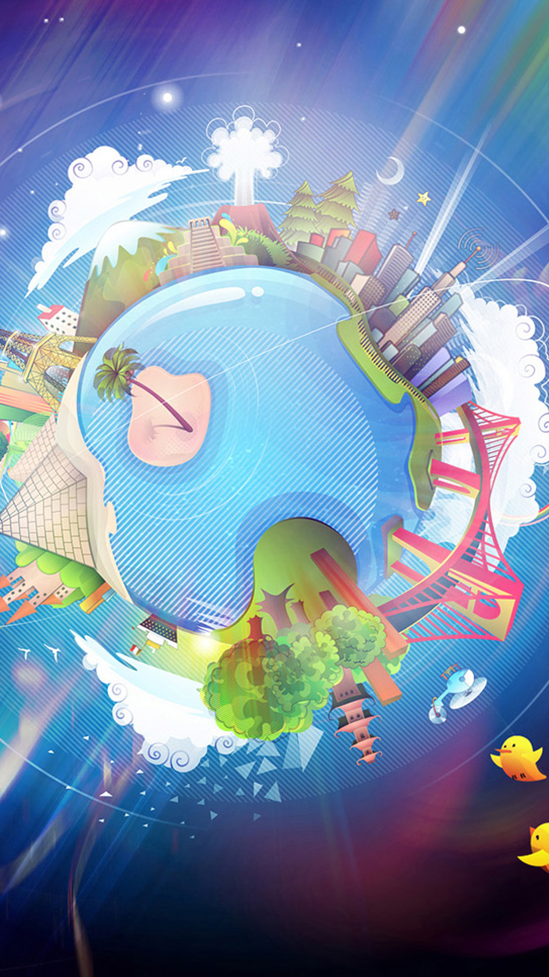 Description: A cartoon character is sleeping on a globe with a city in the background and a rubber duck floating in the water.