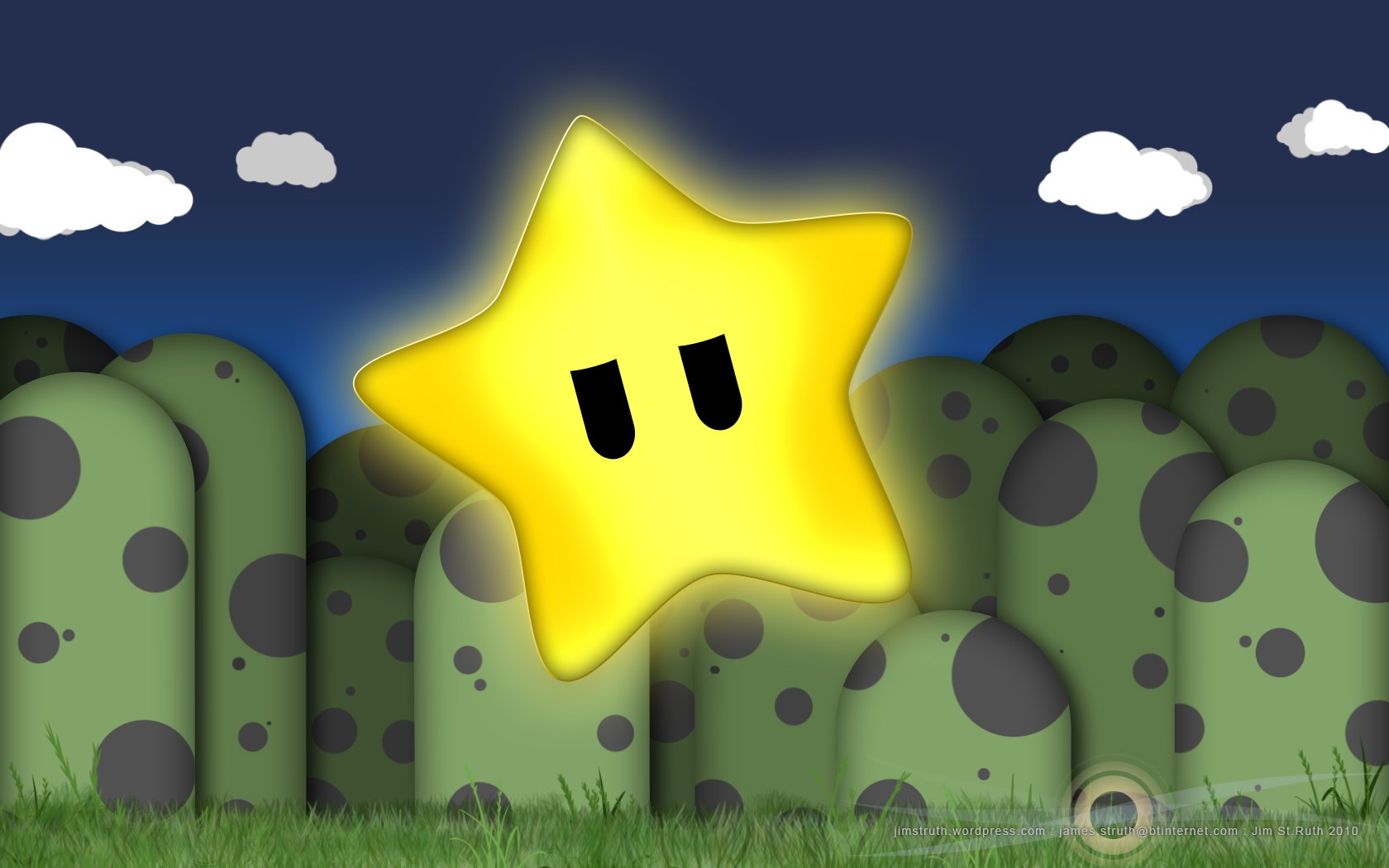 Description: A cartoon star with a face in the middle of a field of grass and rocks with a sky background.