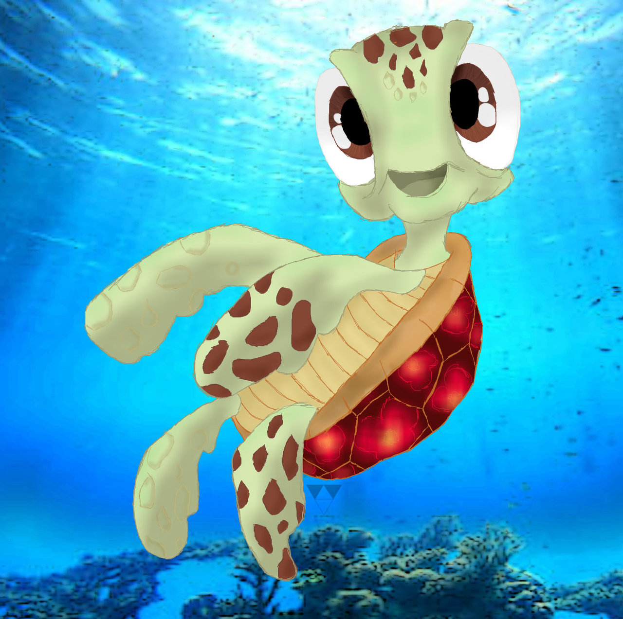 Description: A cartoon turtle swimming in the ocean with a red ball in its mouth and a blue background with corals.
