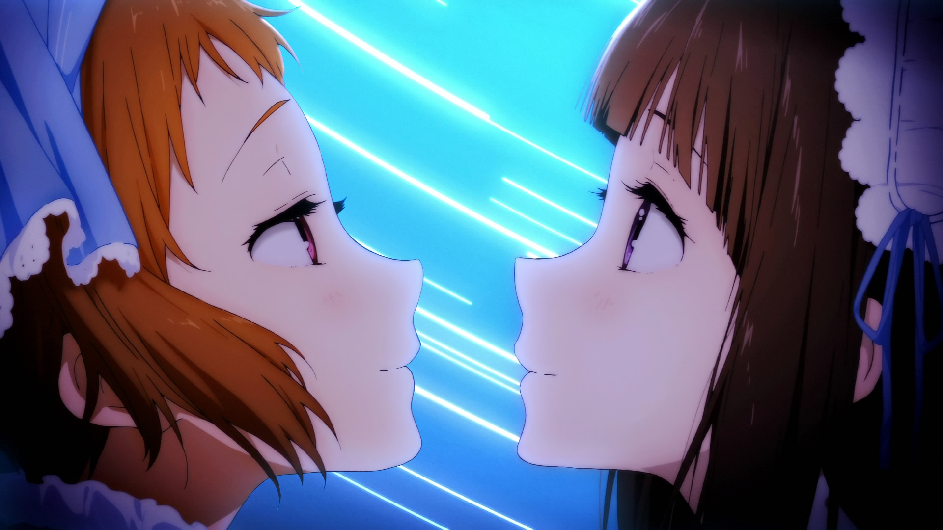 Description: Two people are facing each other in a cartoon style scene with blue lights behind them and a blue background.