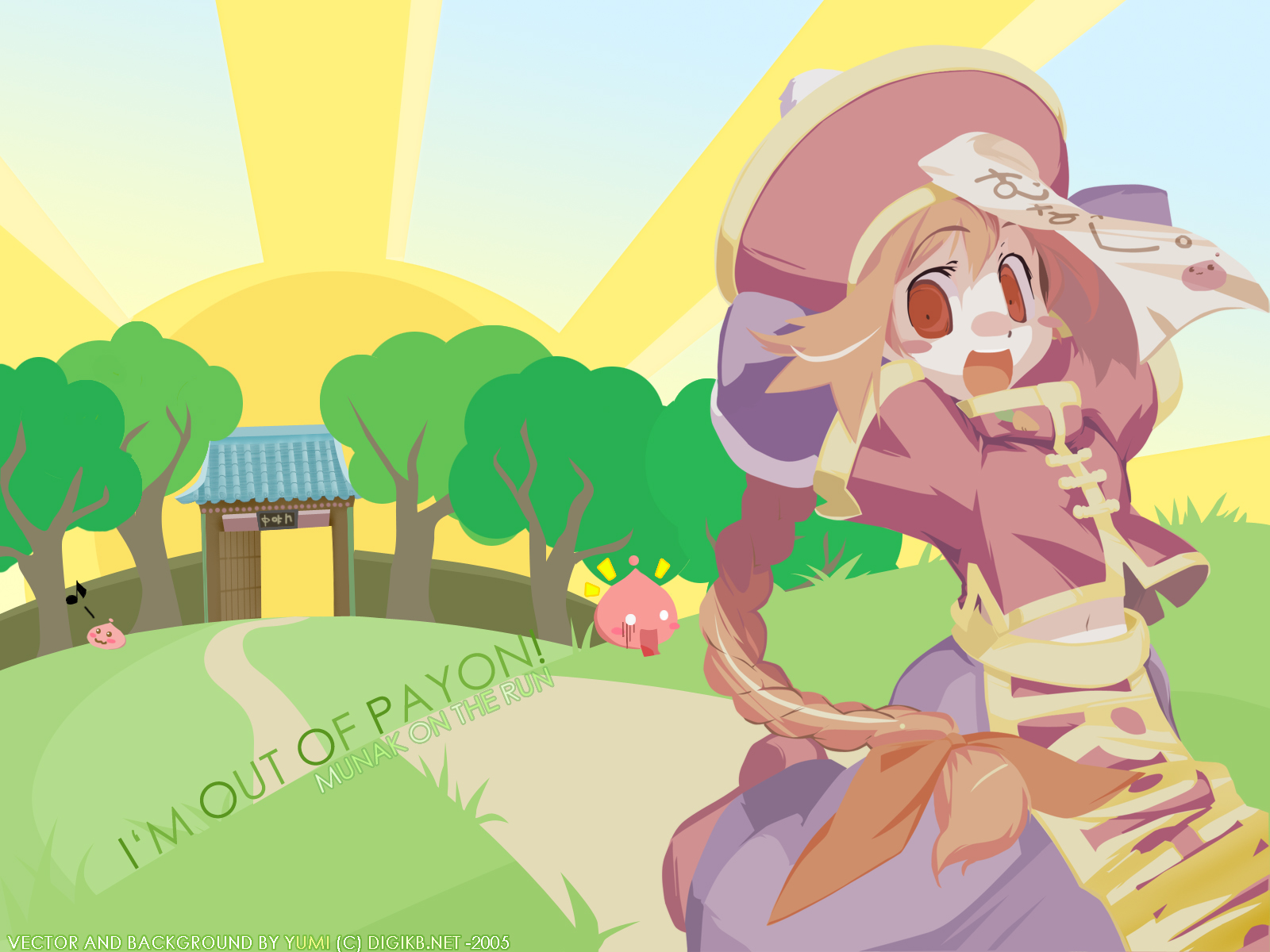 Description: A cartoon of a woman in a dress and hat with a pig in the background and a house in the background.