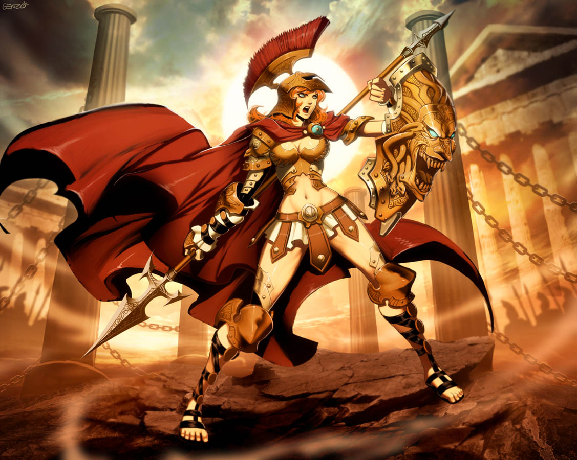 Description: A cartoon of a woman in a red cape holding a sword and a sword in her hand and a chain around her neck.