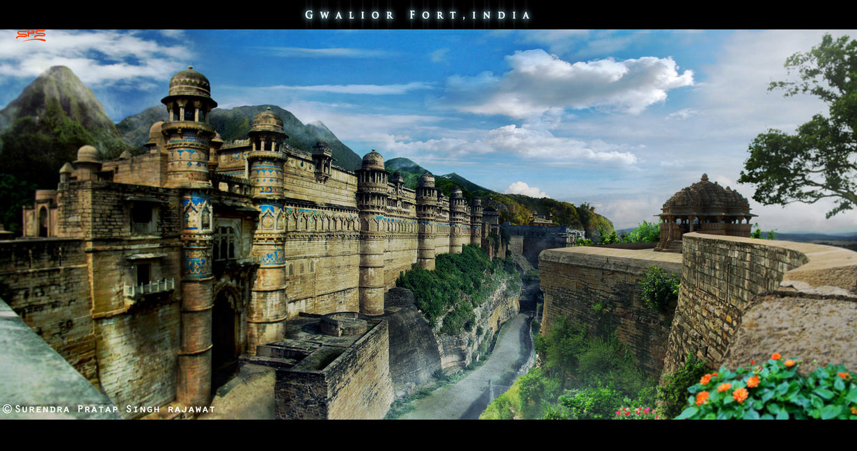 Description: A painting of a castle on a cliff with a river running through it and a tree in the foreground.