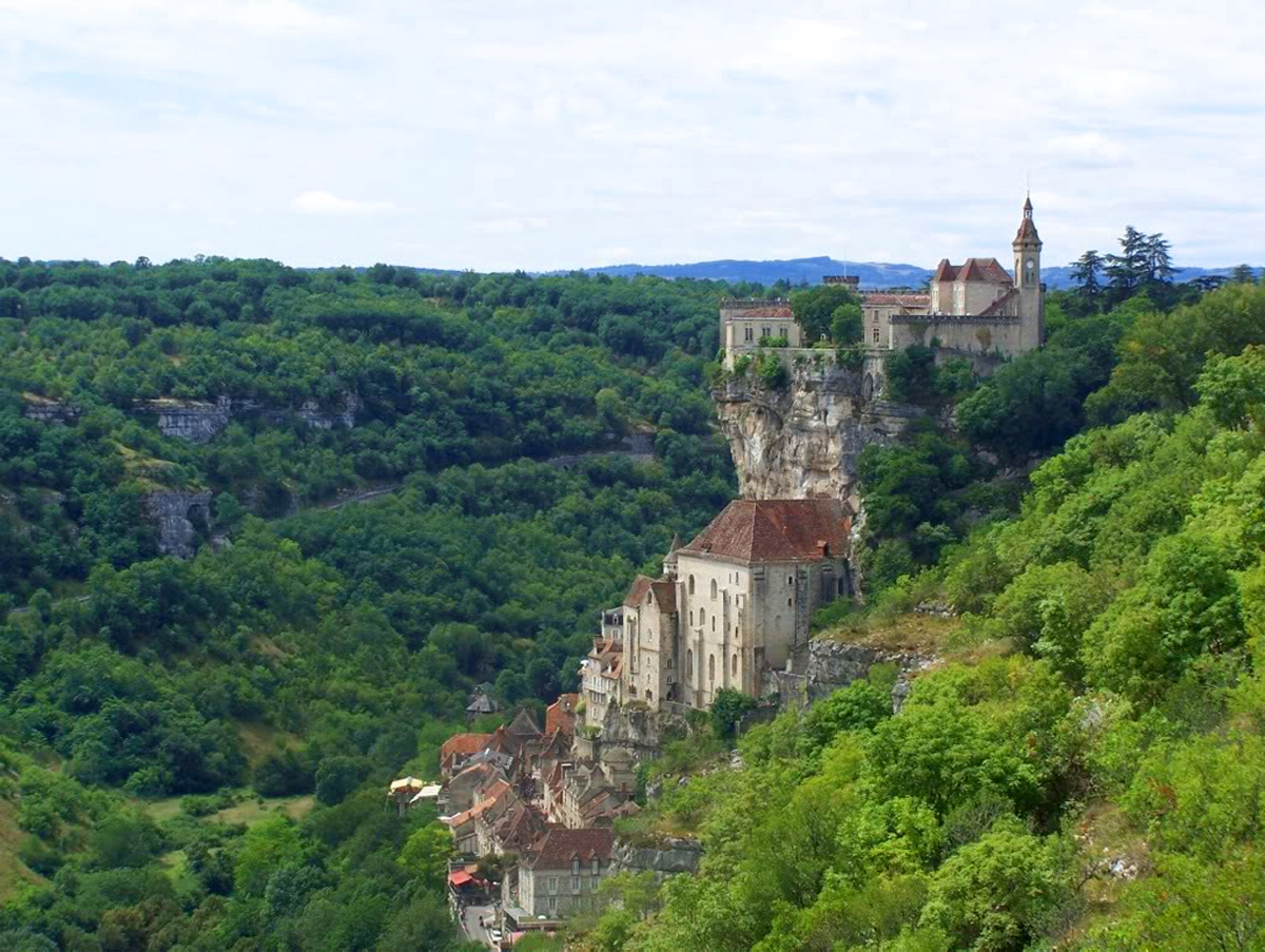Description: A castle on a cliff overlooking a valley and forest area with a river running through it and a castle on the top of the cliff.